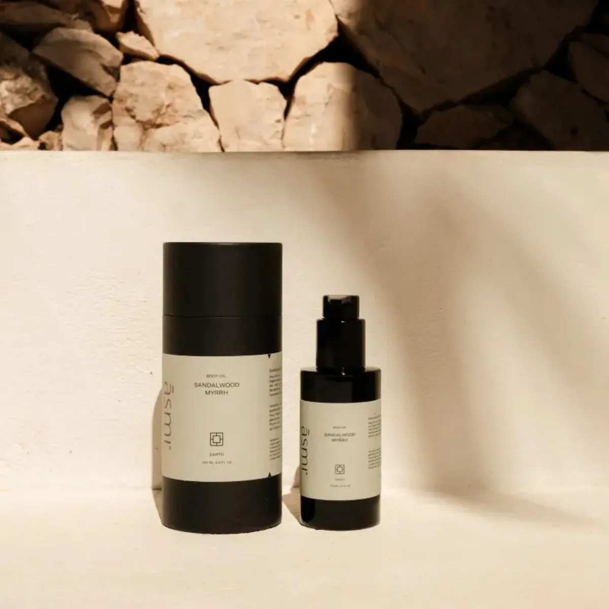 Sandelholz, myrrhe och cederträ ger oljan en varm, djup och harmonisk doftprofil. Dessa eteriska oljor används traditionellt för sina lugnande egenskaper och bidrar till en känsla av närvaro och avslappning. Doften är diskret men långvarig, vilket gör oljan idealisk även som kvällsvård.