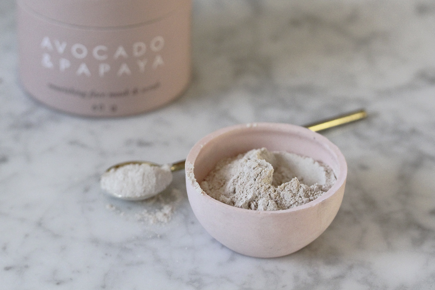 White Volcanic Clay, Persea Americana Fruit Extract (Avocado), Carica Papaya Fruit Extract (Papaya), Oryza Sativa Powder, Carica Papaya (Papaya) Essential Oil, Persea Americana (Avokado) Essential Oil