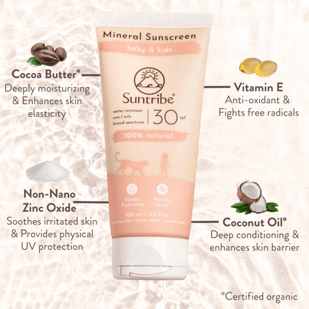 Suntribe Baby & Kids Mineral Sunscreen SPF 30 är en 100 % naturlig och ekologisk solkräm utvecklad för spädbarn från 6 månader och uppåt samt barn med känslig hud. Produkten erbjuder ett tryggt och effektivt solskydd utan onödiga tillsatser. Den mineralbaserade formulan skyddar huden omedelbart vid applicering och lämpar sig för både ansikte och kropp.
