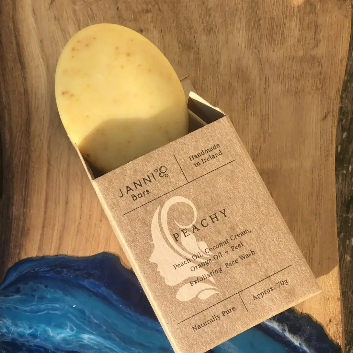 Janni Bars Peachy Exfoliating Face Wash Bar är en mild men effektiv ansiktsrengöring som kombinerar rengöring och lätt exfoliering i ett enda steg. Tvålen är handgjord i Irland med naturliga ingredienser och passar alla hudtyper som vill ha en fräsch, klar och jämn hudton. Den fasta formen gör den plastfri och enkel att använda både hemma och på resa.