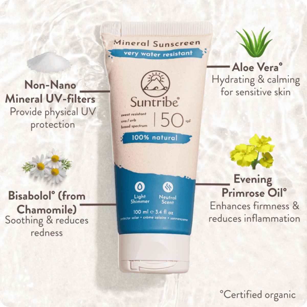 Suntribe Mineral Sunscreen SPF 50 är ett högpresterande, 100 % naturligt solskydd som kombinerar effektivt skydd med hudvänliga ingredienser. Produkten är framtagen för både ansikte och kropp och passar lika bra på stranden som vid fysisk aktivitet på land. Tack vare sin mycket höga vatten- och svettresistens sitter solskyddet kvar även under krävande förhållanden.